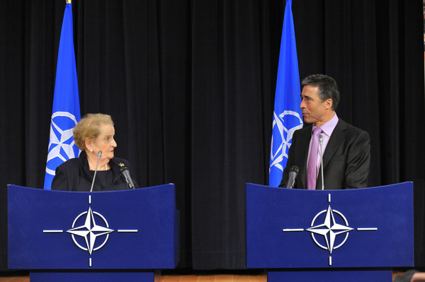 Madeleine Albright si Secretarul General al NATO Anders Fogh Rassmuse la prezentarea oficiala a Raportului privind Conceptul Strategic al NATO. Copyright NATO Press Center