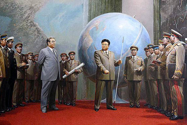 Propagandă nord-coreeană înfățișându-l pe Kim Jong Il preluând ștafeta de lider global (sic) de la tatăl său Kim Il Sung