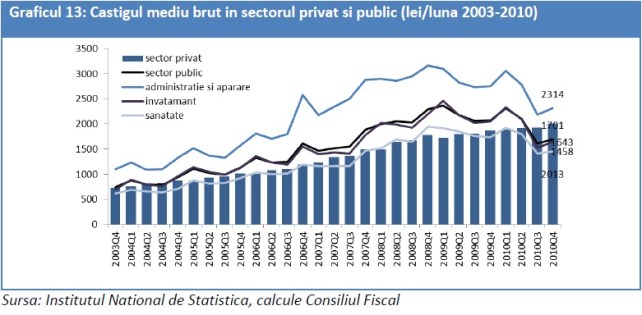 Cu toate acestea, niciodată în vreo astfel de critică a „austerităţii”, plină de epitete minunate şi de cel mai ipocrit sentiment al nedreptăţii, nu se aminteşte că până la finalul anului 2010 câştigul mediu salarial din sectorul public a fost cu circa 20% mai mare decât câştigul salarial mediu din sectorul privat, iar dacă ar fi să vorbim în mod serios de inegalităţi salariale în România, atunci trebuie ştiut că cele mai mari se regăsesc în interiorul sectorului public, unde salariile (dar şi alte beneficii non-salariale) ale angajaţilor din administraţie, mai ales cea centrală, şi armată, de pildă, pot trezi invidia oricărui angajat obişnuit din vreo multinaţională privată care operează în ţară, după cum se poate vedea în graficul de mai sus preluat din  raportul remis de Consiliul Fiscal în martie 2011.
