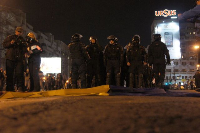 Jandarmii se masează de o parte şi de altă, în costumaţie de luptă, nimeni nu explică nimic. Tensiunea creşte iar eu hotărăsc, după ezitări, că am venit să apăr democraţia, nu o bucată de ciment. Încet, încet mai mulţi protestatari iau aceeaşi decizie. Astfel, la ora 19.00 rămân pe carosabil doar cele două grupuri dispuse să joace jocuri de copii tâmpiţi: ultraşii şi jandarmii. Frigul mă înconjoară şi plec să mă încălzesc cu Leacul Durerii.