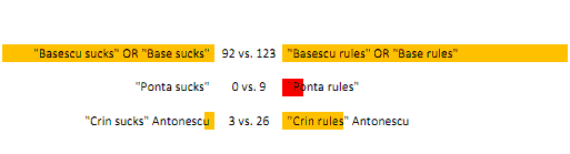Prin 2011, într-un moment de plictiseală, m-am apucat să măsor frecvenţă pe Google a expresiilor „X sucks” vs. „X rules”, unde X=Băsescu, sau Ponta sau Crin Antonescu. Metodologia o găsiţi aici.