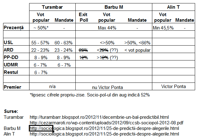 Ce diferă între aceste aşteptări? Barbu Mateescu presupune o prezenţă semnificativ mai mică decât Turambar. Deşi Barbu nu ne-a lăsat de data asta să ne uităm prea mult în bucătăria statistică, am putea deduce că nu aşteaptă doar o prezenţă general mai scăzută (consistentă cu ipoteza lui Mircea Kivu, a încrederii scăzute în politicieni). Dimpotrivă, putem  presupune că aşteaptă şi o mobilizarea mai slabă a USL, conform unor ipoteze ale sale mai vechi. Alin Teodorescu are un model intermediar pe care nu îl spune.