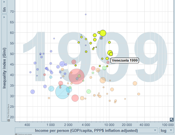 În 1999, când acesta ia puterea Venezuela este simultan unul stat cu cetăţeni cu venituri ridicate (pentru America Latină) şi inegalitate scăzută (sursa).