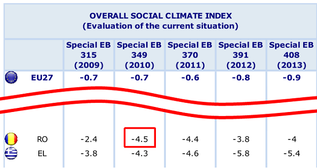În 2010 România are cel mai slab climat social din Uniune. În toți ceilalți ani suntem întrecuți de Grecia. (sursa)