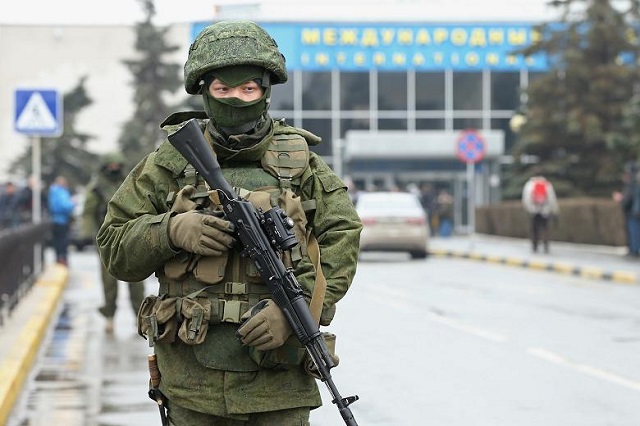 Înainte de decizia parlamentului Rusiei de a interveni în Crimeea, instituțiile administrative din Simferopol, capitala Crimeei, și aeroportul internațional din acel oraș au fost ocupate de forțe militare. Forțe militare, în uniformă dar fără semne distinctive, au stabilit filtre pe principale căi de acces în Simferopol. Uniformele și echipamentul acestor forțe militare indică că de fapt cei care au preluat controlul în Simferopol sunt militari ruși. Lipsa însemnelor distinctive de pe uniforme, contrară uzanțelor internaționale, reprezintă un tertip prin care Rusia încearcă să mascheze o agresiune militară împotriva unui stat suveran.
