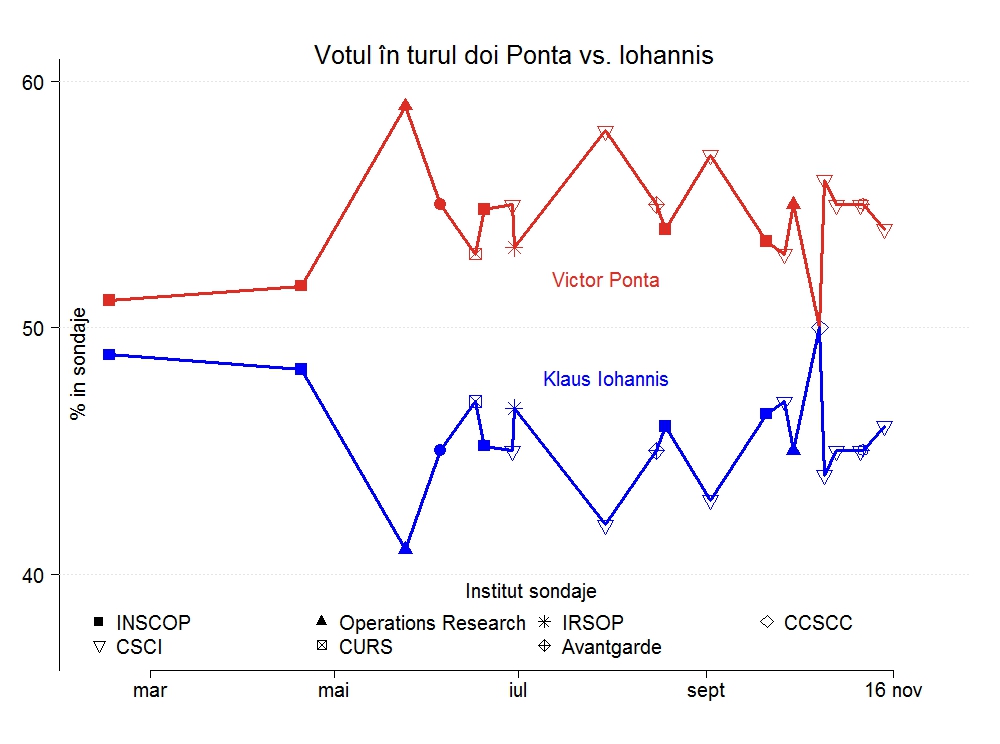 Ambele tabere nu mai sunt polarizate pe teme centrale (precum tema Băsescu în 2012). Ambele tabere reușesc cumva să fie asociate de alegători cu valorile și interesele proprii. Asta explică stabilitatea sondajelor atât pentru turul 1 (nu am vorbit despre ele în articol) cât și pentru turul 2. De aceea, privind sondajele putem prevedea că Victor Ponta va câștiga alegerile. Dacă se vor înregistra simultan prezență scăzută în populația vârstnică din rural și crescută în Transilvania putem aștepta unele emoții pe parcursul zilei. Dacă nu, nu.