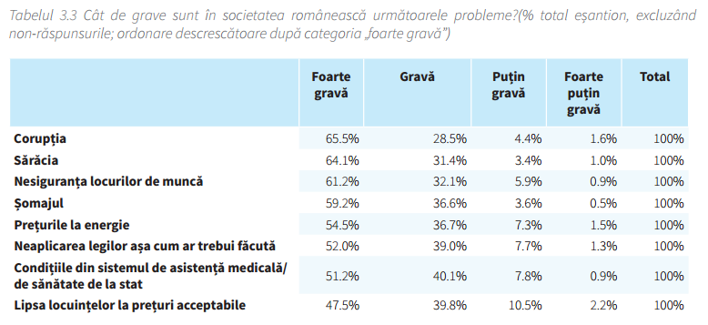 Prin comparație, tabelul 3.3 reflectă o întrebare ușor neclară din punct de vedere logic pentru că nu face diferența între gravitate intrinsecă (% de cazuri afectate de problemă) și gravitatea impactului social. Mai mult, întrebarea este pusă la începutul chestionarului, putând conduce la un răspuns mai superficial. Am fi tentați să spune că, iată. Graficul 8.5 este agenda „adevărată” și primul tabel ilustrează o întrebare prost pusă. Dar …