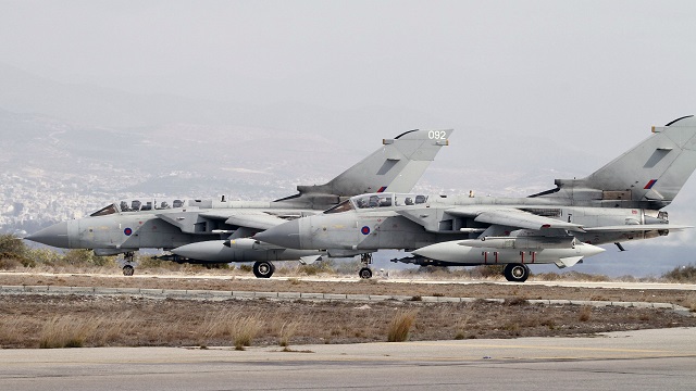 Two Royal Air Force Tornado GR4 fighter jets prepare to take off Saturday from an airbase in Cyprus. The British warplanes were heading on their first mission over Iraq since being given parliamentary authority to strike at ISIS Friday.