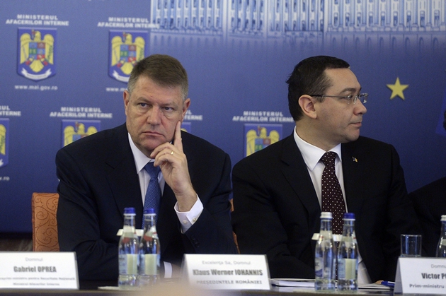 Primul Ministru Victor Ponta (D) impreuna cu Presedintele Romaniei, Klaus Iohannis (D) participa la sedinta de evaluare a activitatii desfasurate de Ministerul Afacerilor Interne (MAI) in anul 2014, in Bucuresti, luni, 23 martie 2015. MARIUS DUMBRAVEANU / MEDIAFAX FOTO