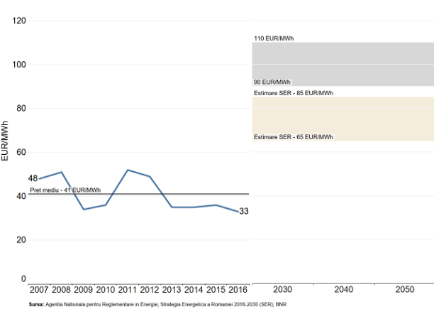 Notă: Preţul afişat în grafic, 2007-2016, este Preţul Zilei Următoare (PZU), preluat din rapoartele anuale ale ANRE; Banda bej reprezintă estimările preţului energiei electrice în perioada 2030 -2050 cf. SER; Banda gri reprezintă estimările autorului pentru necesarul preţului energiei electrice în 2030-2050 pentru ca proiectul reactoarelor 3 şi 4 să fie justificat economic.
