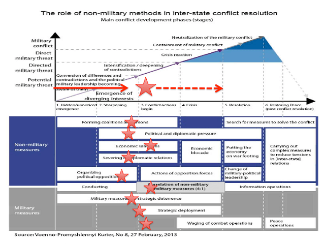 Sugestiv este și faptul că exemplul pe care generalul rus îl vede ca întruchipând modalitatea tipică de a purta războiul în secolul XXI este Primăvara Arabă. Or, ce vedem în ultimii ani la nivelul Occidentului este tocmai amplificarea deliberată a potențialului de protest public, de contestare, proliferarea mișcărilor antiestablishment sub diverse forme și umbrele. Semnificativ este și faptul că, în ultimul deceniu, în academiile militare ruse sunt redescoperiți și redevin influenți teoreticieni ai subversiunii din timpul Războiului Rece, cei care vedeau la orizont „o nouă formă de conflict, în care luptătorii sunt nu atât armatele, cât mișcările populare; (…) lupta se duce în junglele nepătrunse ale sufletului, în psihicul popoarelor“, iar „fronturile politice, sociale și economice“ vor fi decisive.