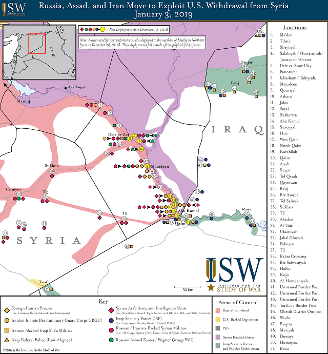 În același timp, o prezență americană limitată era importantă în perspectiva unei regiuni în care Iranul și forțele sale proxy sunt angajate într-o amplă competiție de remodelare a Orientului. Contrabalansarea Teheranului devenise, pe fondul retragerii SUA din JCPOA (mult hulitul acord nuclear parafat de Administrația Obama), un obiectiv central al strategiei americane. Iar rolul contingentului american în dispozitivul regional de contrabalansare a Iranului nu poate fi ignorat. În timp, oficialii administratiei au articulat în detaliu această misiune secundară. De exemplu, consilierul pe probleme de securitate națională John Bolton spunea astfel în septembrie: